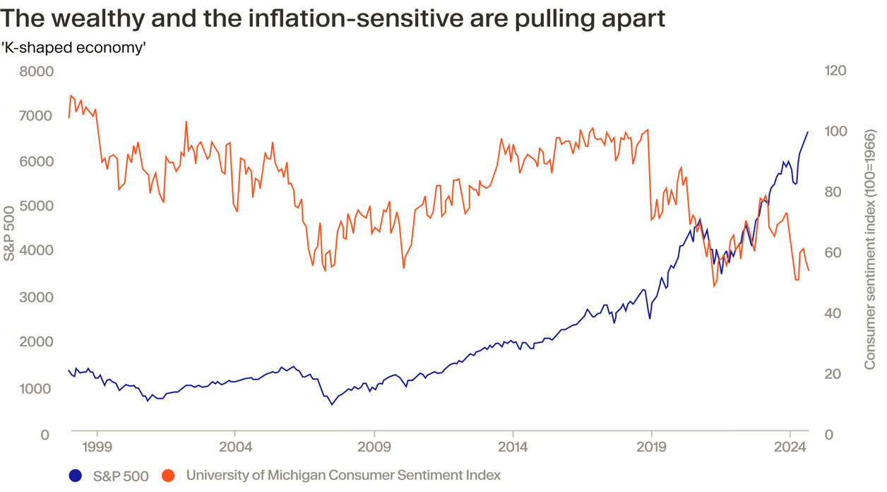 Now all of the talk is of a K-shaped economy, which refers to multiple divergences between the price-insensitive wealthy and those in economic precarity who are sensitive to inflation. The services sector is either shedding jobs or holding back from hiring, in contrast to the upper echelons of the technology and finance industries where unprecedented levels of wealth are being created.