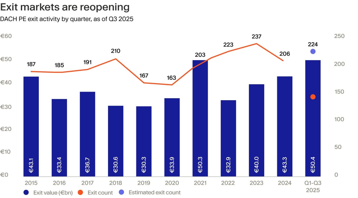 Liquidity conditions across DACH private equity markets are also improving, with €50.4 billion realised across 224 exits in the first three quarters of 2025. Activity remains concentrated in secondary and sponsor-to-sponsor transactions which now account for over half of total value, the highest share on record. In our view, this reflects cautious buyer behaviour amid still-selective public and strategic exit markets.⁵