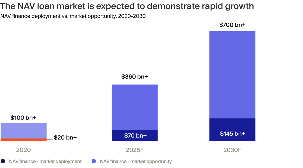The trajectory points steeper still. 17Capital estimates $70 billion in NAV finance deployment in 2025, with the market potentially reaching $145 billion out of a total addressable market of $700 billion by 2030⁵ as funds beyond their investment period seek ways to tap liquidity.
